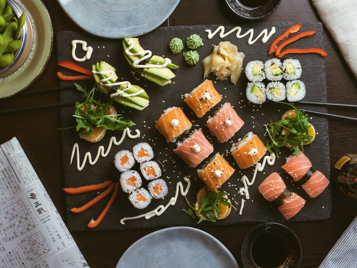 Avocado, Beans, Bell Pepper, Carrot, Cashew, Ginger, Mango, Mungo, Salmon, Wakame